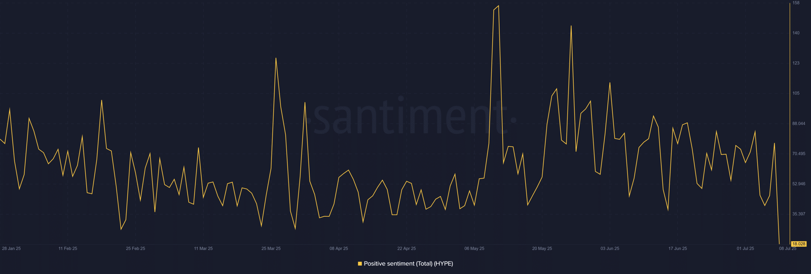 Positive sentiment surrounding HYPE has plunged to 18.02—the lowest reading in over two months.
