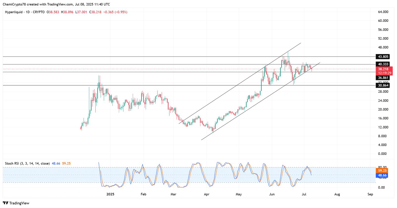 HYPE recently broke below its ascending channel support after multiple failed attempts to reclaim the $40–$43 range.