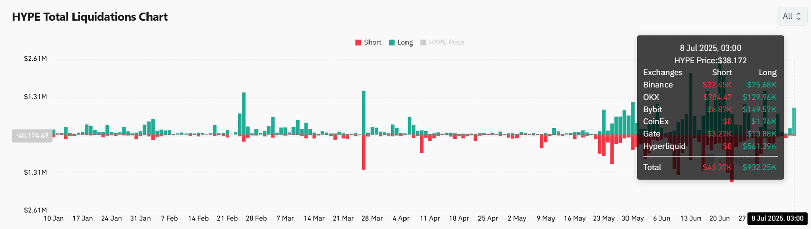 At the time of writing, long liquidations on HYPE exceeded $932K, dwarfing the $43K in short liquidations.