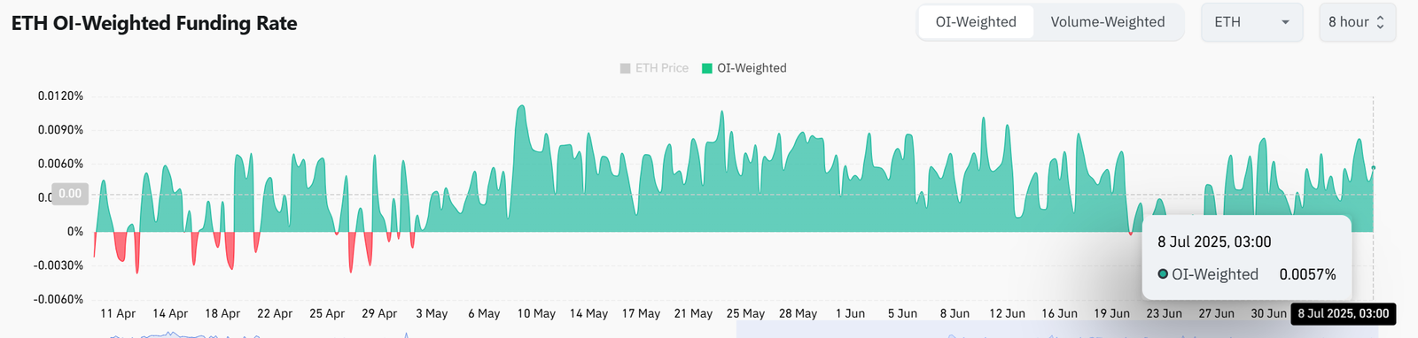 At the time of writing, ETH’s Open Interest-Weighted Funding Rate remained positive at 0.0057%, reinforcing bullish bias in the derivatives market.