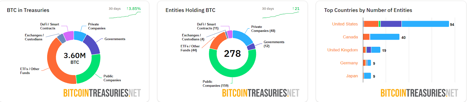 Following the new wave of institutional buying, over 278 public entities are now holding Bitcoin, up from 124 just weeks ago, according to BitcoinTreasuries.NET.