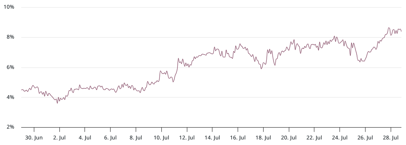 Global markets remain focused on United States import tariff negotiations, as analysts warn that failure to reach a deal could sharply increase recession risks. Despite a trade agreement reached with Europe on Monday, China’s deadline looms on Aug. 12. As a result, traders appear more inclined to hold cash or allocate to short-term bonds.