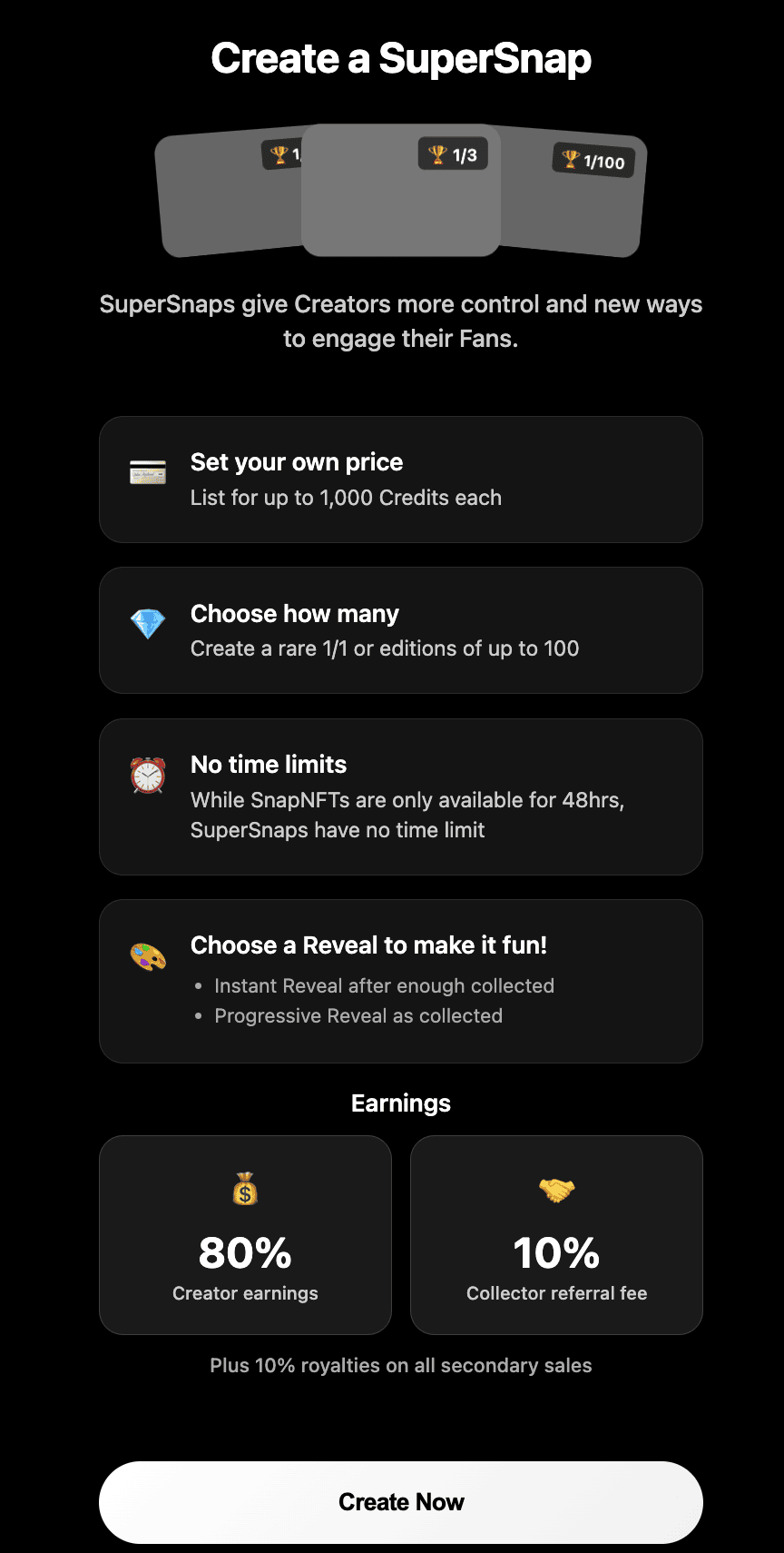 SuperSnaps are a special type of NFT unlocked by standout SnapNFT creators and OneHub artists, with more flexibility on pricing, reveal style, limited supply, and no time limits on drops.