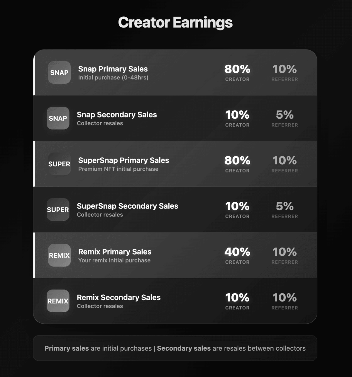 - Secondary Sales: The remixer and the Original Creator each receive a 10% revenue split