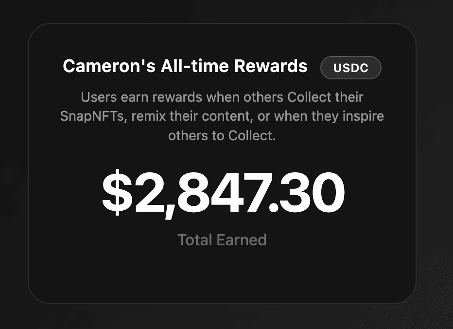 Collectors can also earn 80% of a secondary sale when SnapNFTs are sold and can review their total rewards balance at any time on their Collect profile: