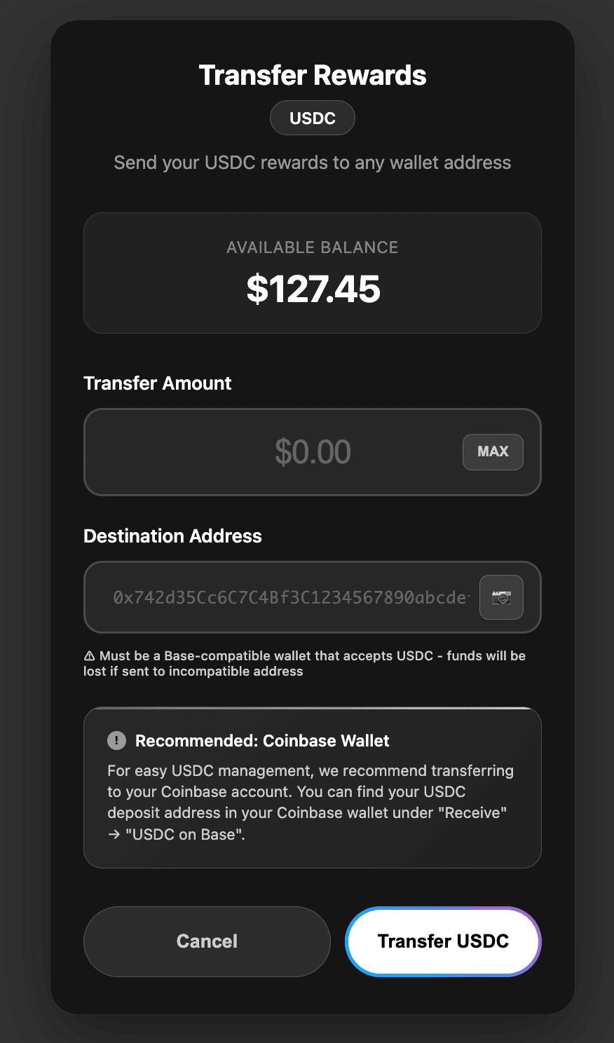 - Flexible Withdrawals: Transfer earnings to a Coinbase account or any external wallet.