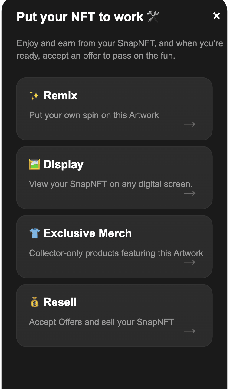 On Collect, SnapNFT holders can resell (or “flip”) NFTs in their collection; however, the value goes beyond trading. Each SnapNFT unlocks creative possibilities: holders can remix their NFT (with the original artist’s approval), display it on any screen, and even turn it into custom physical items through their Put Your NFT to Work feature.