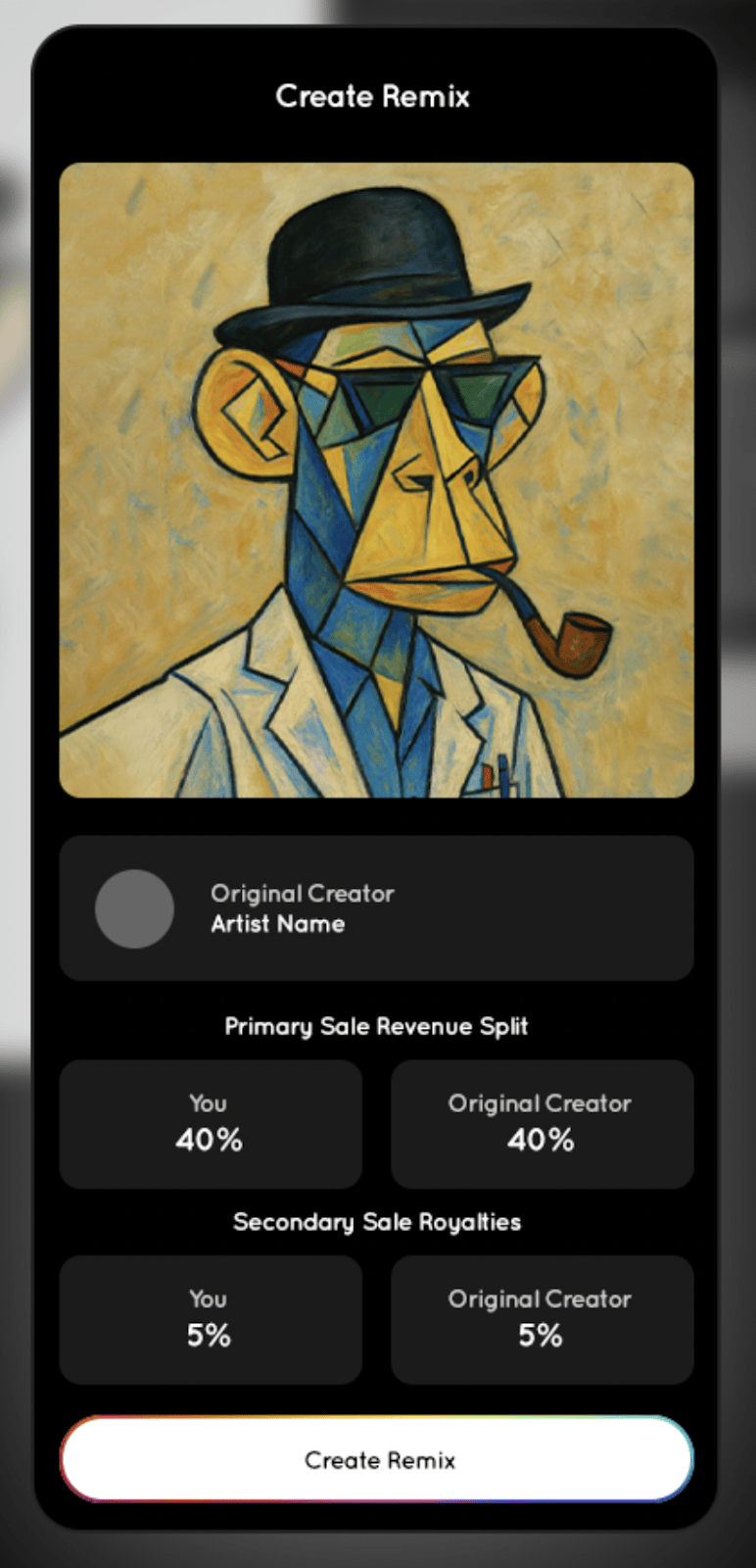 - Primary Sales: The collector who produces the Remixed NFT (Remixer) and the Original Creator each receive a 40% revenue split