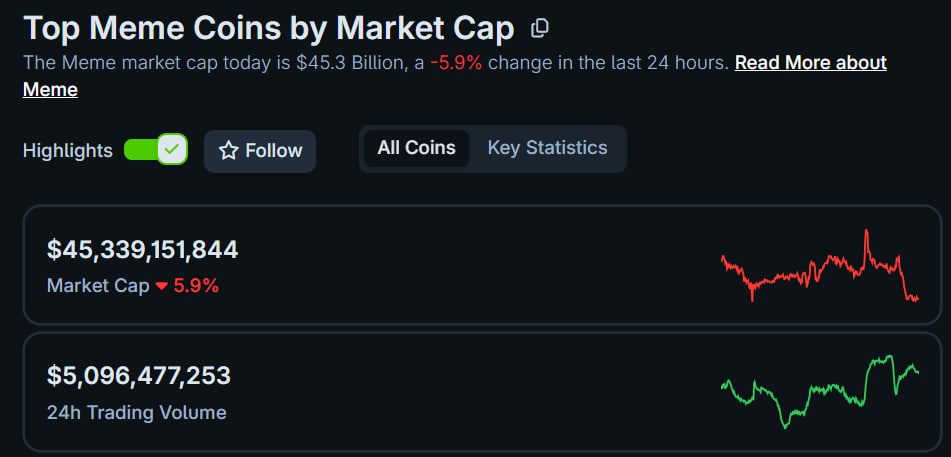 Meme assets’ trading volume surged to surpass $5 billion, signaling robust activity from participants likely trimming their holdings.