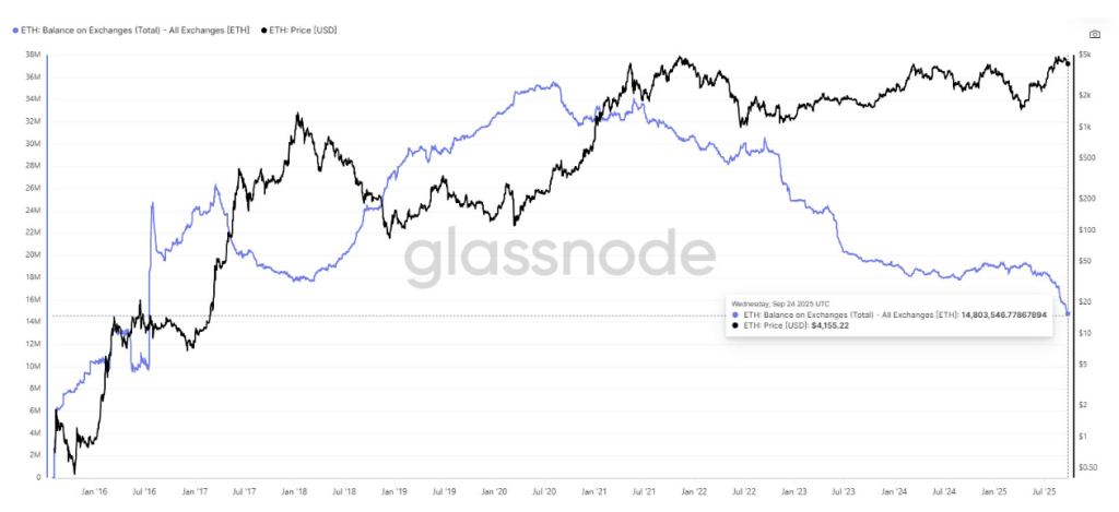 Interestingly, Ethereum last week’s outflows ties into a notable trend that has been developing in recent months. Data shows that Ethereum’s total supply on exchanges has dropped to just 14.8 million ETH, its lowest level since 2016. Much of this supply has been redirected into staking, long-term cold storage, and DeFi protocols, which have all led to a drastic decline in the ETH on trading platforms.