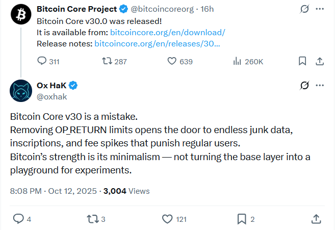 “As a (hopefully) temporary measure, run Knots. I strongly recommend not upgrading to Core v30,” noted pioneer cryptographer Nick Szabo via X last week.