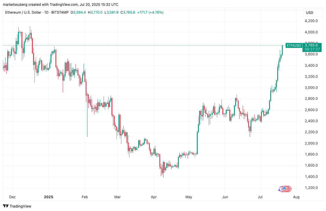 On Sunday, ETH/USD traded above $3,750 for the first time since December 18, 2024.