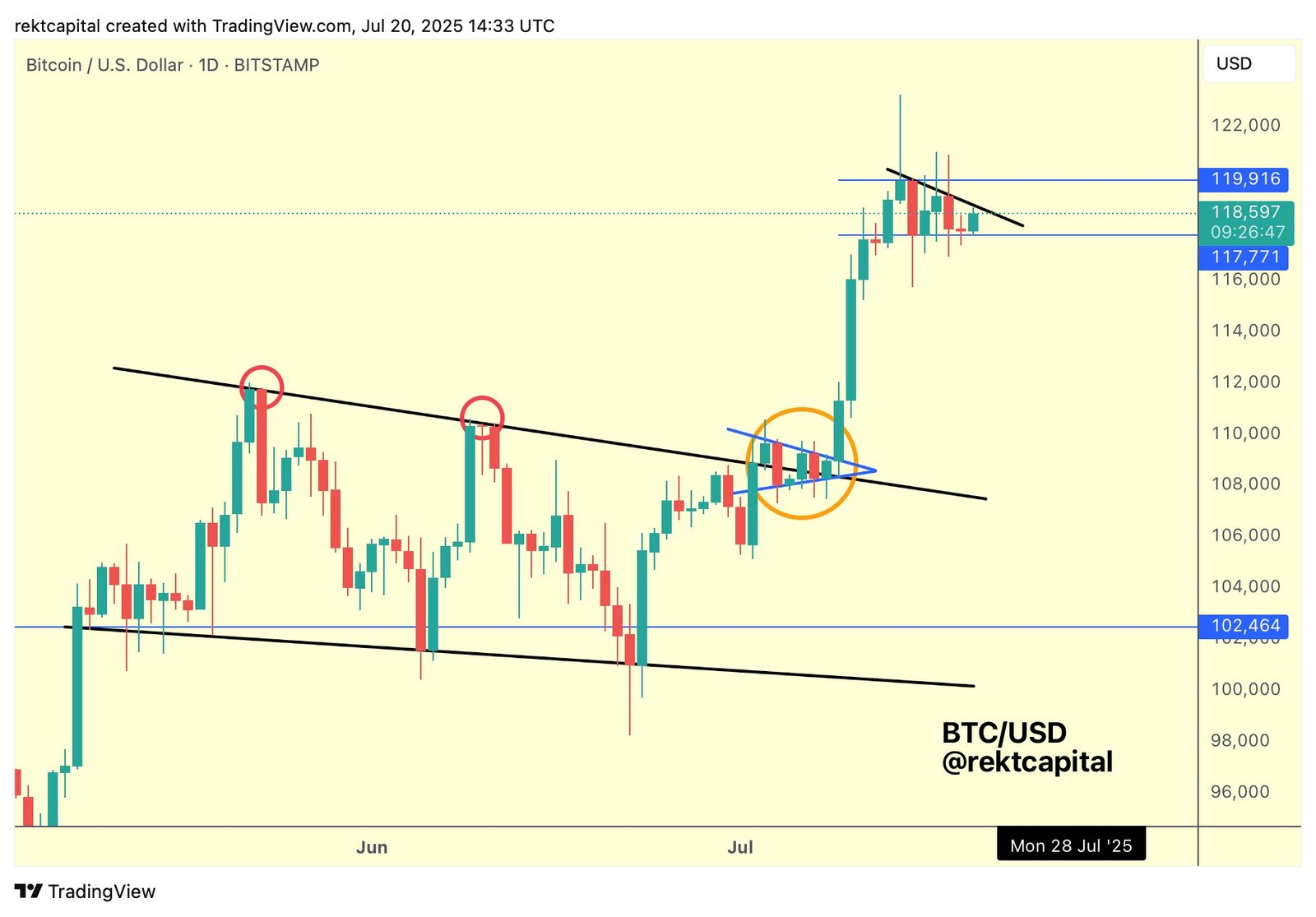 Bitcoin market participants expect a resistance trend line breakout, with nearby targets including $125,000.
