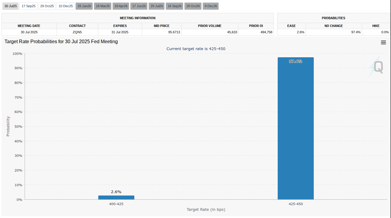 The latest data from CME Group’s FedWatch Tool nonetheless showed no hint of change in market sentiment regarding rate cuts at the Fed’s upcoming meeting on July 30.