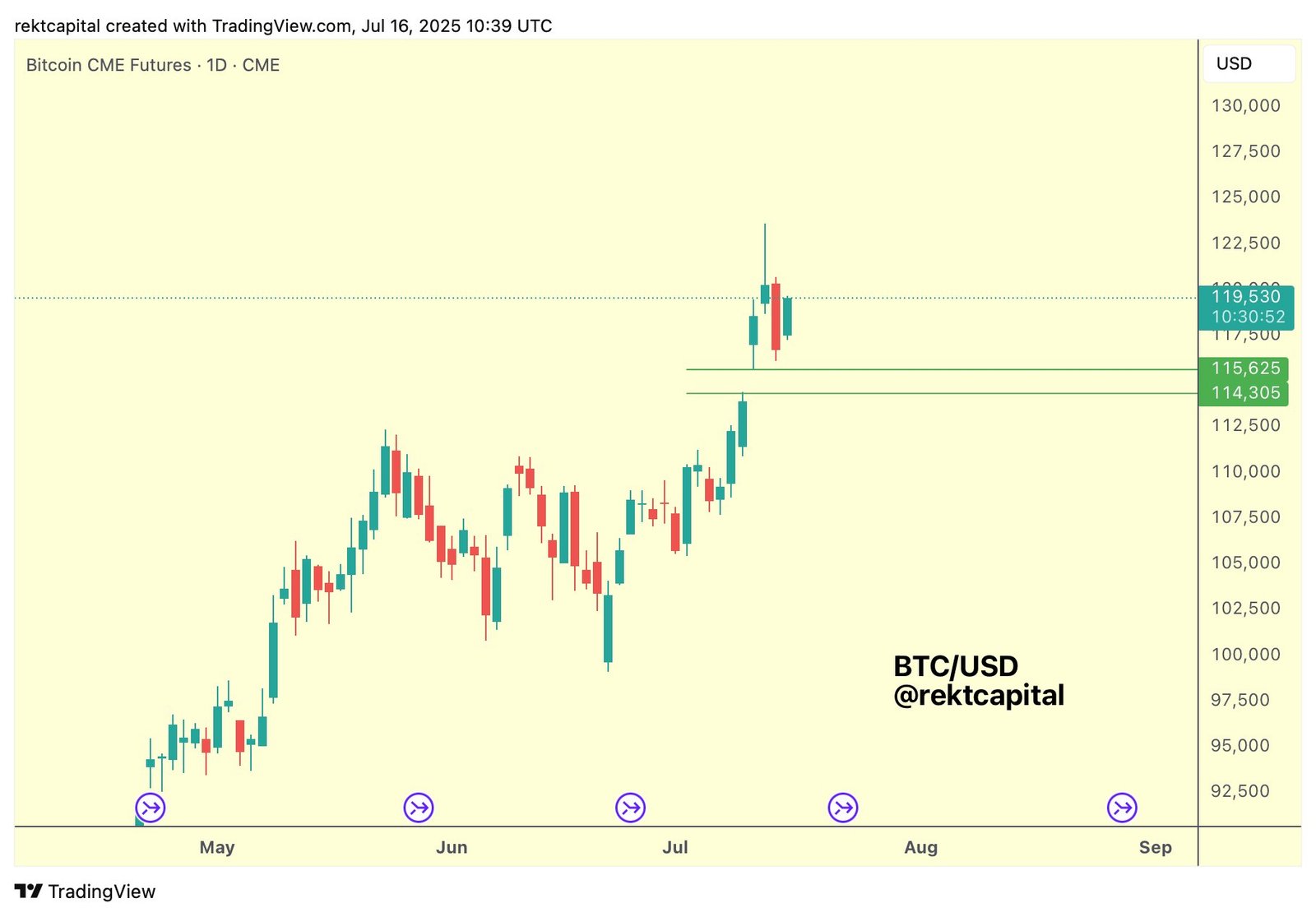 Rekt Capital referred to the “gap” left between closing and opening levels on CME Group’s Bitcoin futures markets, which typically draw price toward them after forming. The gap in question lies between $114,300 and $115,600.
