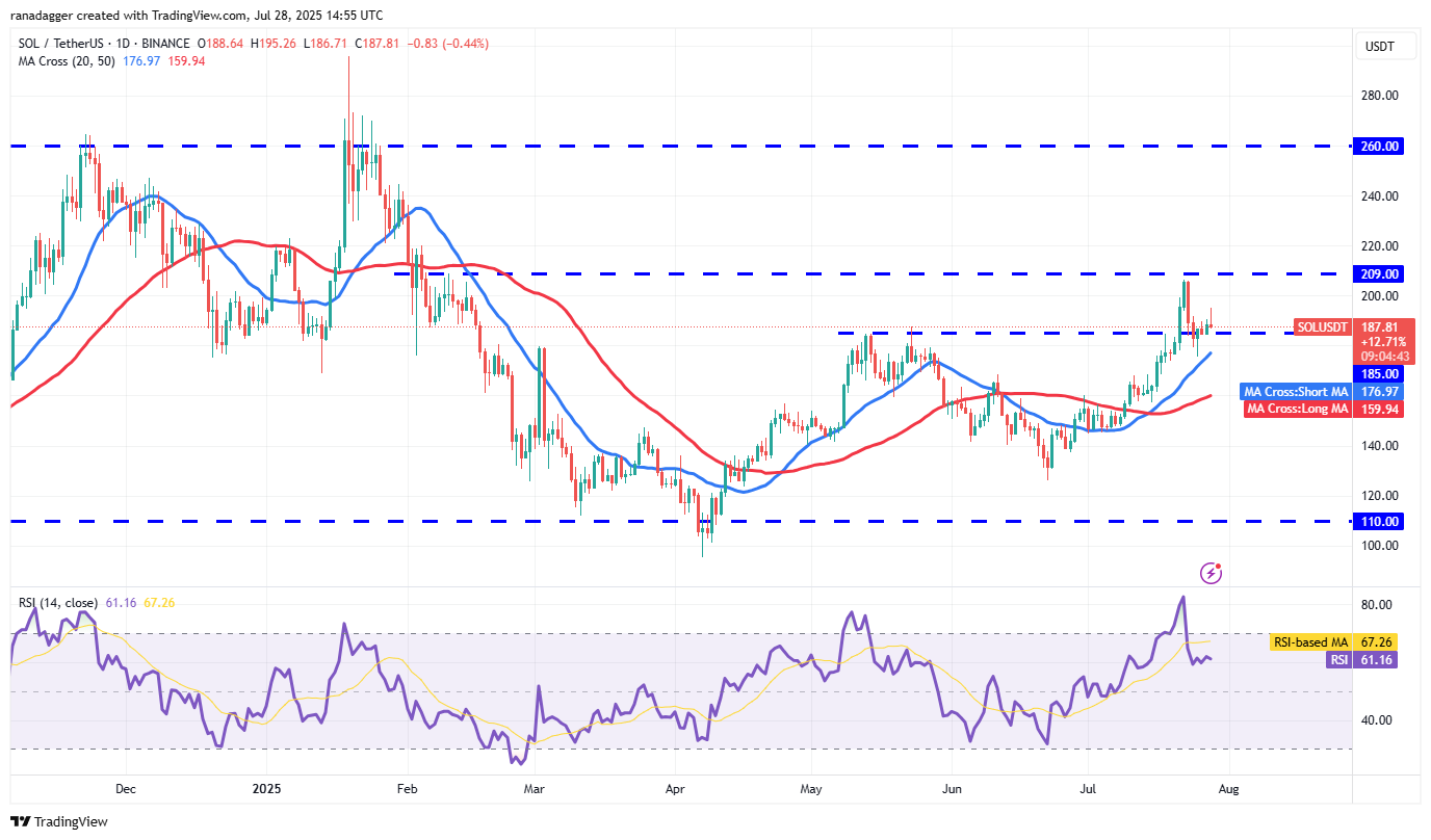 Solana’s (SOL) pullback from $209 on Wednesday stalled at the 20-day SMA ($176) on Friday, indicating demand at lower levels.