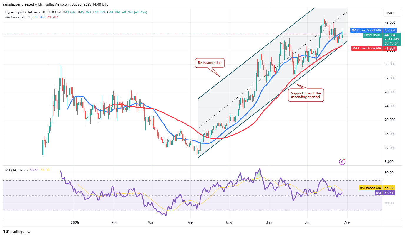 There is resistance at the 20-day SMA ($45.06), but if the bulls overcome it, the HYPE/USDT pair could rise to $48 and subsequently to $50. Sellers are expected to mount a strong defense at $50.