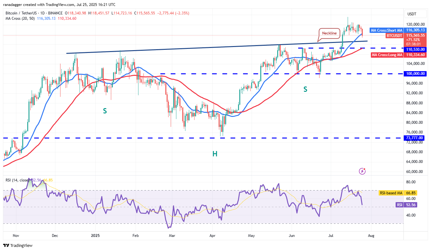 BTC has slipped below the 20-day simple moving average ($116,305), indicating that the bears are trying to make a comeback.