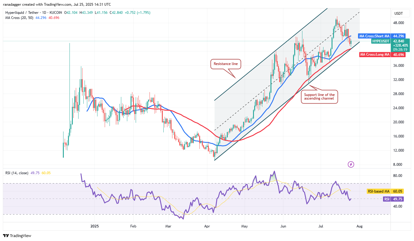 The 50-day SMA ($40.69) is also placed near the channel’s support line, indicating that the bulls are likely to defend the level with vigor. If the price rebounds off the support line and rises above the 20-day SMA, it suggests the HYPE/USDT pair may remain inside the channel for some more time. The pair may climb to $48 and then to $49.87.