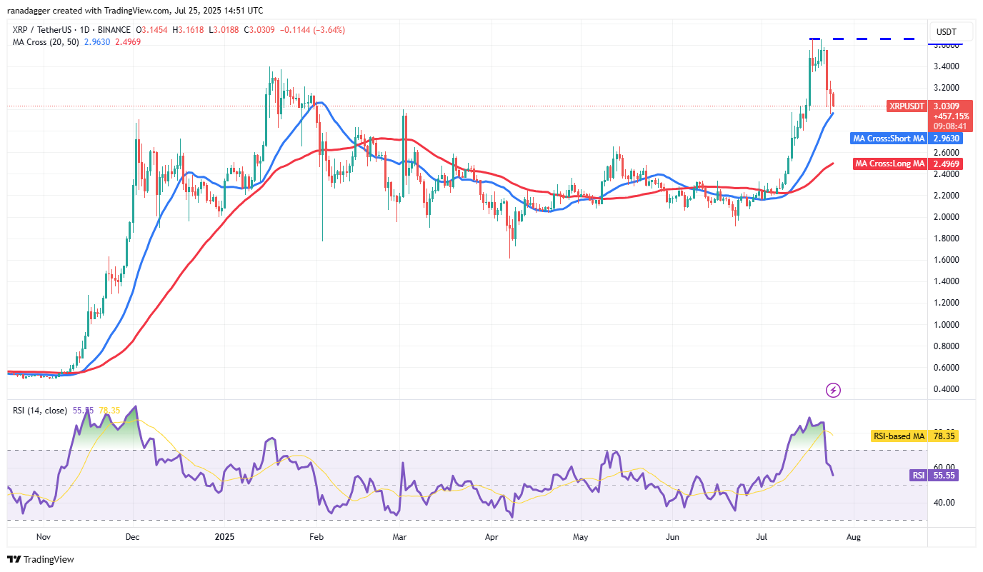 Failing to resume the uptrend may have tempted short-term buyers to book profits. That pulled the price to the 20-day SMA ($2.96), which is likely to act as a strong support. If the price rebounds off the 20-day SMA with strength, the bulls will make one more attempt to kick the XRP/USDT pair above $3.66. If they succeed, the pair could ascend to $4 and then to $4.50.