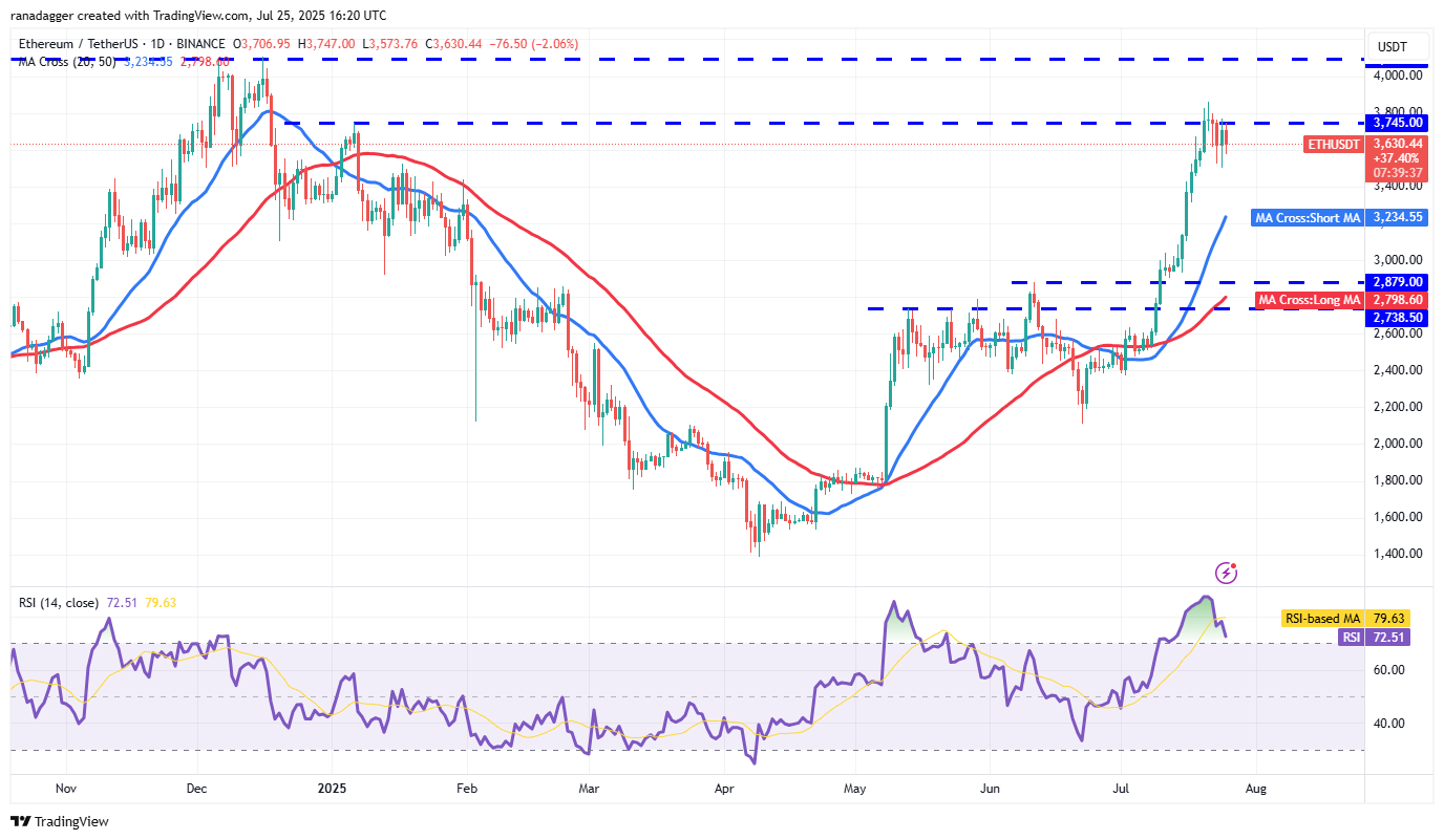 The first support on the downside is at $3,500. A break and close below $3,500 opens the gates for a fall to the 20-day SMA ($3,234). Buyers are expected to fiercely defend the 20-day SMA because a break below it tilts the advantage in favor of the bears.