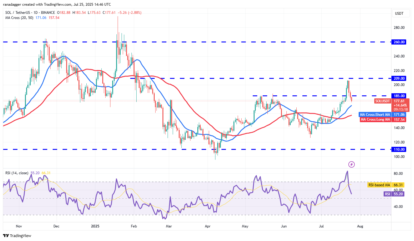 There is strong support at the 20-day SMA ($171). If the price rebounds off the 20-day SMA, the bulls will again attempt to thrust the SOL/USDT pair above $209. If they can pull it off, the pair may jump to $240 and eventually to $260.