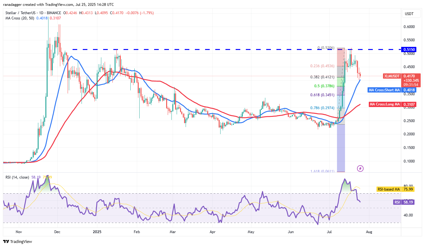 Stellar (XLM) pulled back from $0.52 on July 18 and has reached the 20-day SMA ($0.40), which is likely to attract buyers.