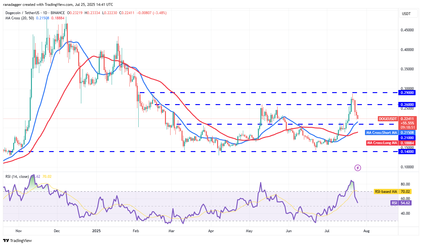 The price turned down from $0.29 on Monday but is likely to find support at the 20-day SMA ($0.21). If the price rebounds off the 20-day SMA, the bulls will try to drive the DOGE/USDT pair to $0.29. A break and close above $0.29 could start a new uptrend toward the target objective of $0.44.
