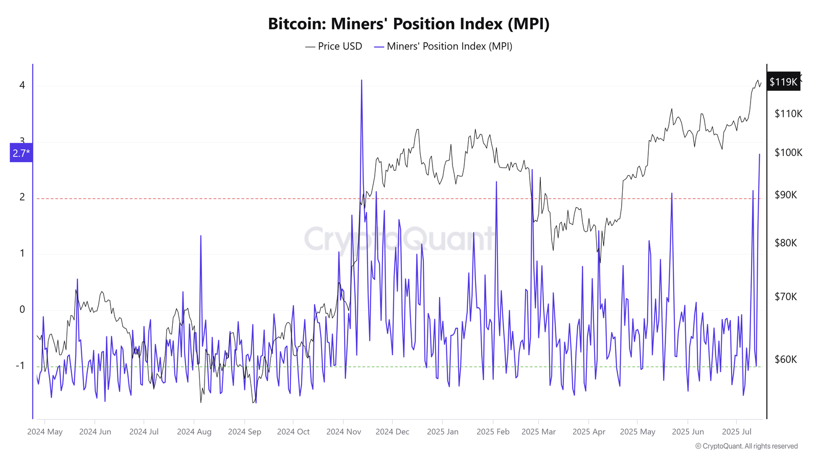 The Miners’ Position Index surged to its highest level since November 2024, and profit-taking hit record highs.
