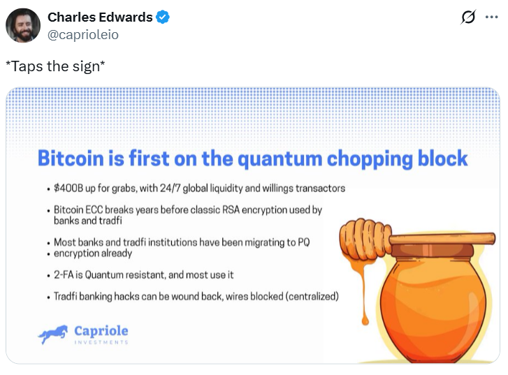 However, Edwards has long argued the threat is more imminent and that Bitcoin will be “first on the quantum chopping block” because most banks and institutions are already migrating to post-quantum encryption and fraudulent transactions can be wound back or blocked.