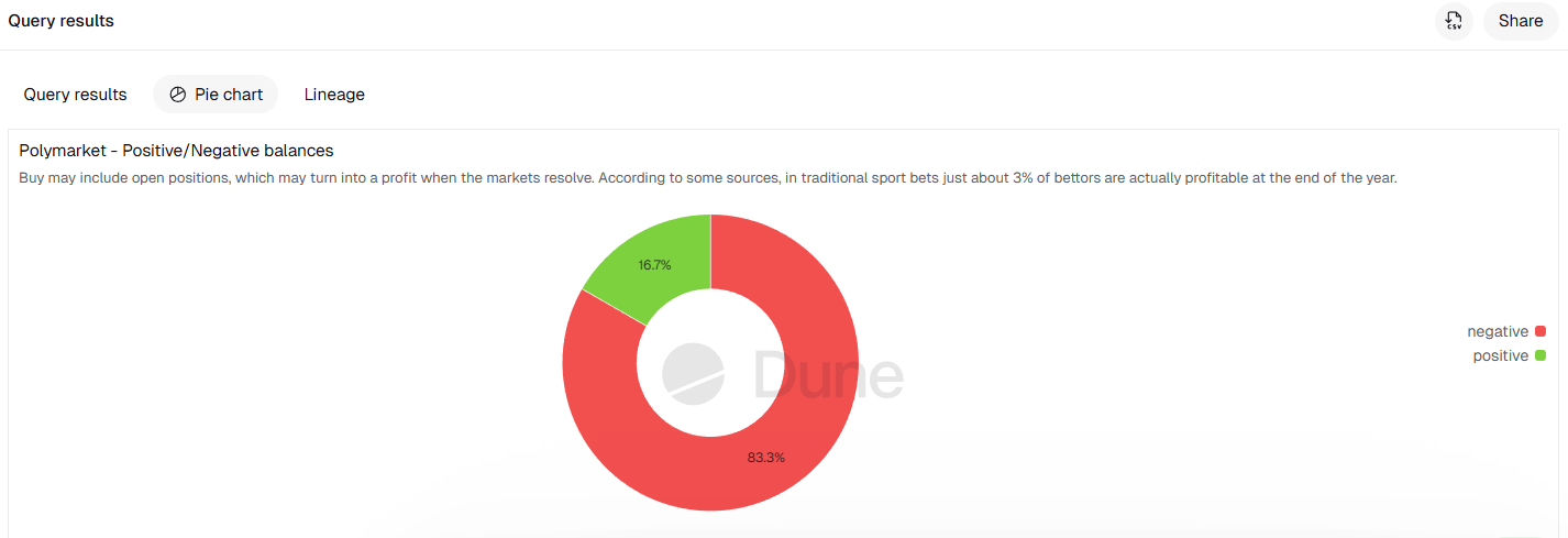 Only about 16.7% of wallets on Polymarket are in profit, while the remaining 83% have incurred losses, according to blockchain data from Dune.