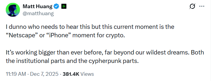 The cryptocurrency industry is approaching its “Netscape” moment, as steady progress in blockchain infrastructure and the rise of regulated investment products drive a new wave of institutional adoption, according to Paradigm co-founder Matt Huang.