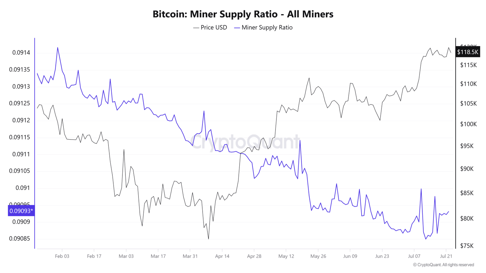 Broader market trends show that Bitcoin miners have a long-term outlook. The Miner Supply ratio on CryptoQuant continues to rise, signaling increased reserve accumulation among miners.