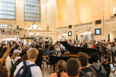 Juilliard student Joshua Mhoon, who is studying for a Masters in music, puts on a piano performance in the Grand Concourse as part of Dear New York.