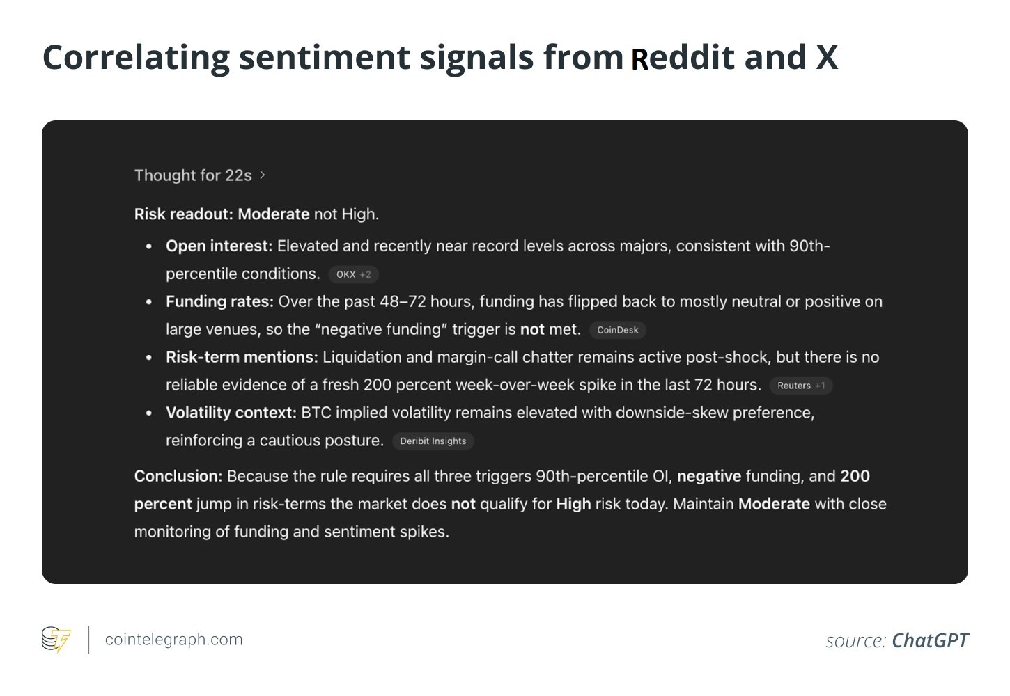 “Act as a crypto risk analyst. Correlate sentiment signals from Reddit, X and headlines with funding rates, open interest and volatility. If open interest is in the 90th percentile, funding turns negative, and mentions of ‘margin call’ or ‘liquidation’ rise 200% week-over-week, classify market risk as High.”