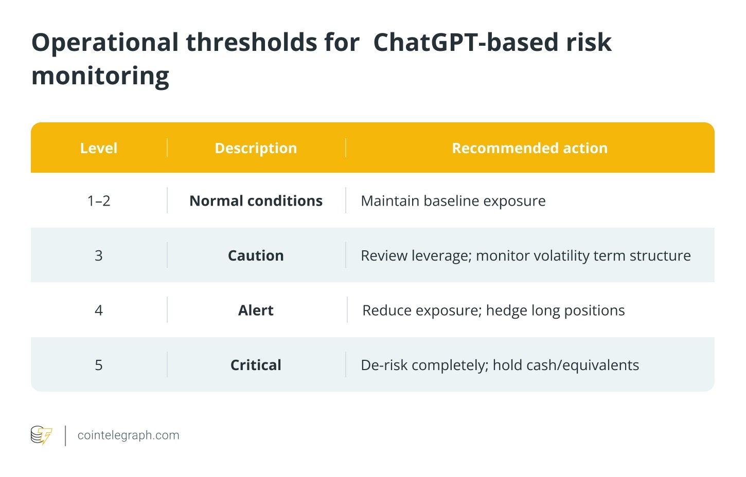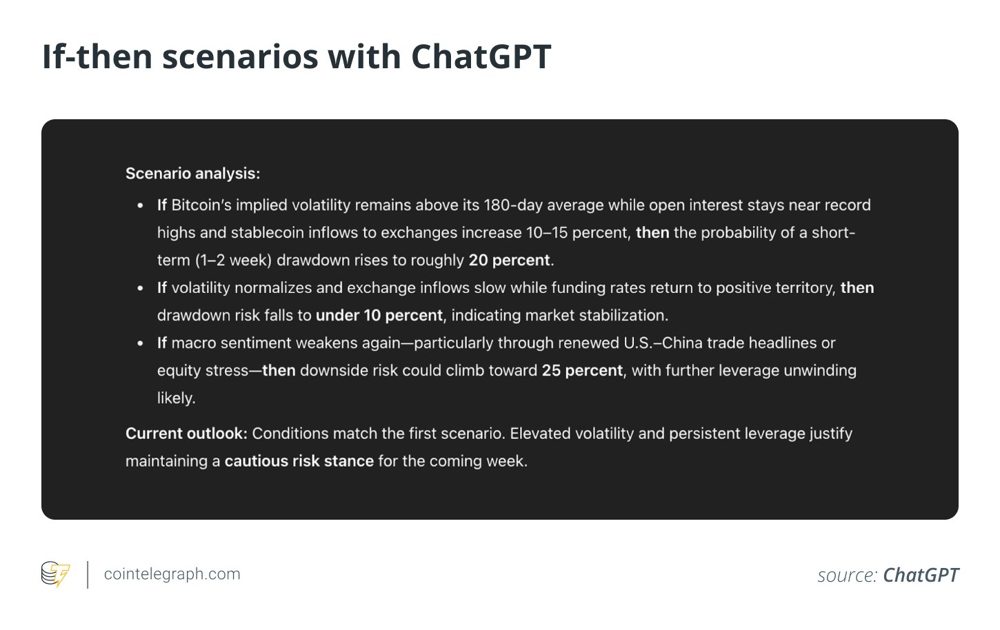 By linking text trends with numerical indicators such as funding rates, open interest and volatility, ChatGPT can help estimate probability ranges for different market risk conditions. For instance:
