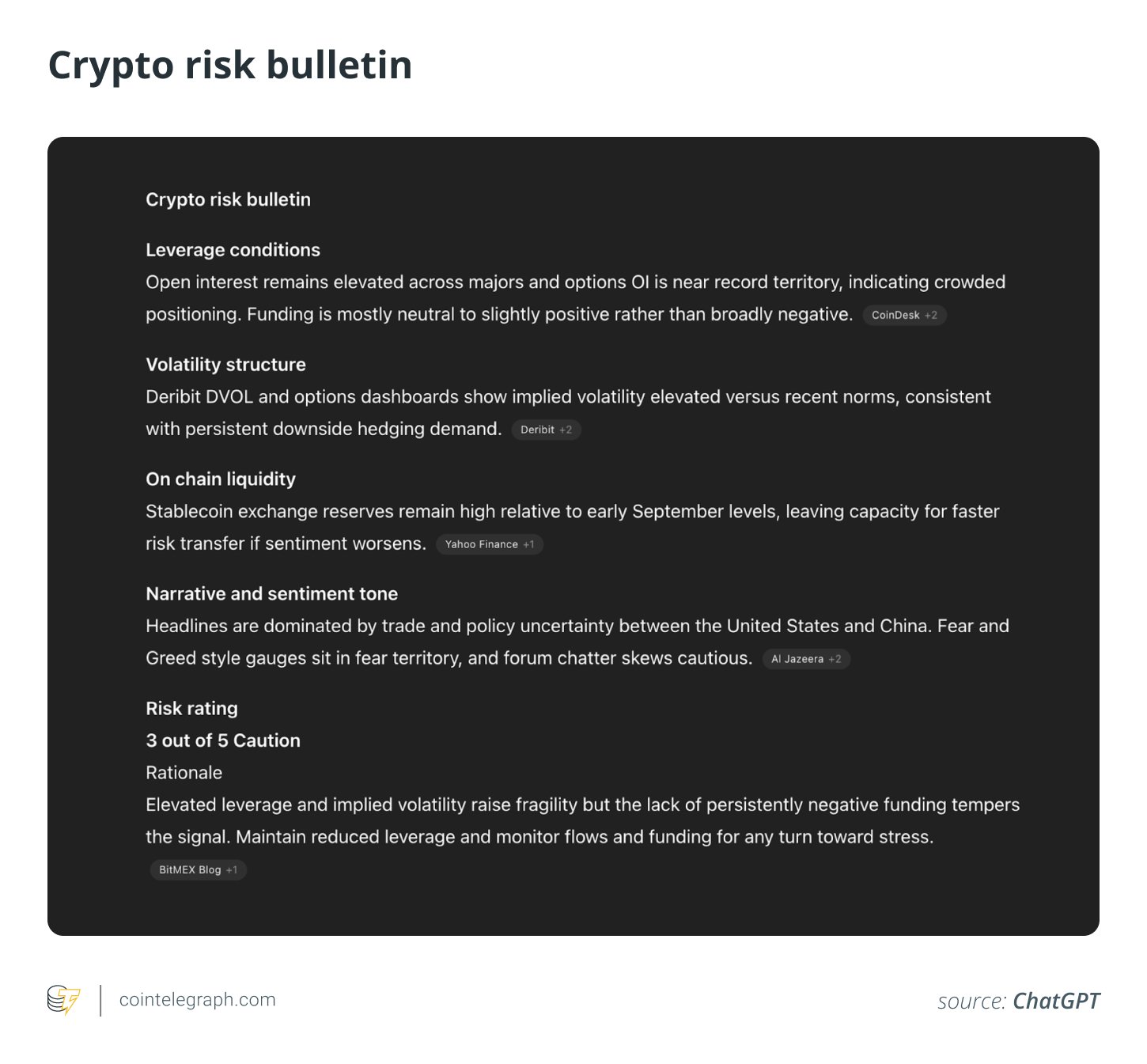 “Act as a crypto market risk analyst. Using the provided data, produce a concise risk bulletin. Summarize current leverage conditions, volatility structure and dominant sentiment tone. Conclude by assigning a 1-5 risk rating (1=Low, 5=Critical) with a brief rationale.”