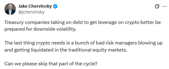 Critics have warned that the excessive debt leverage deployed by the treasury firms to buy more BTC and altcoins could pose a liquidation risk to the entire sector and TradFi if they go bankrupt.