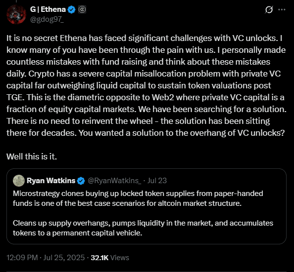 Ethena [ENA] Labs founder, Guy Young, has defended crypto treasuries as the best shot at solving the infamous Venture Capital (VC) token unlocks and dumping in the space.
