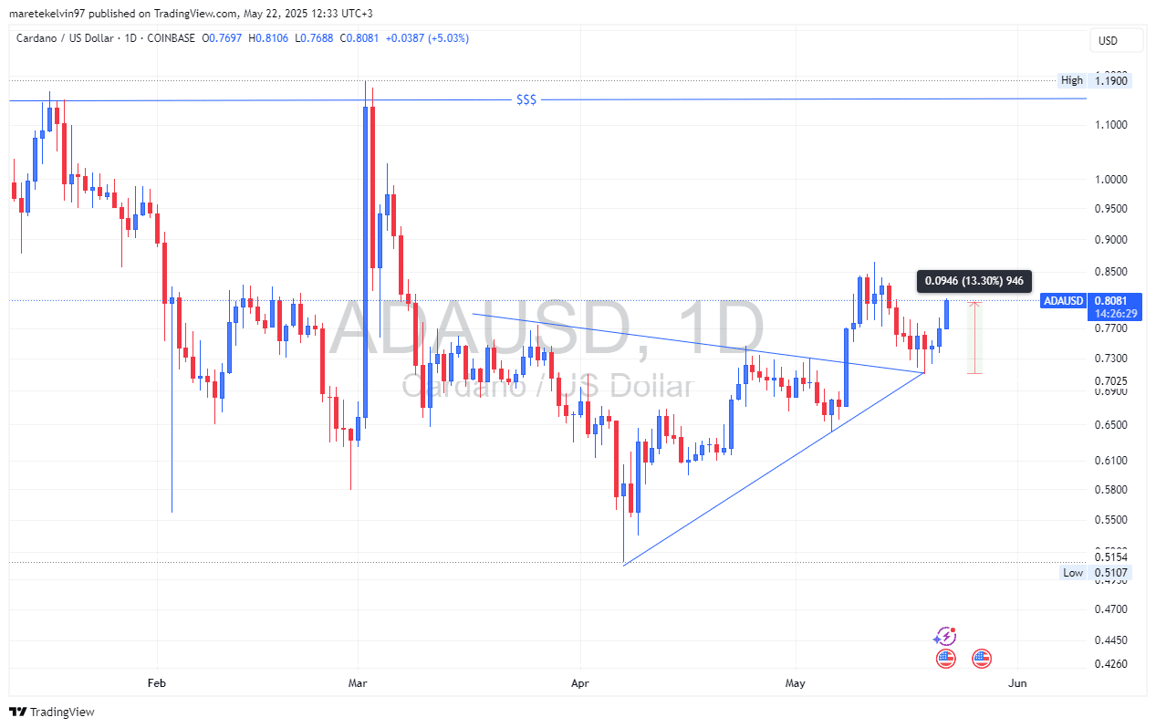 The rebound followed a textbook retest, confirming the validity of the pennant formation. For many traders, this solidified ADA’s short-term bullish structure.