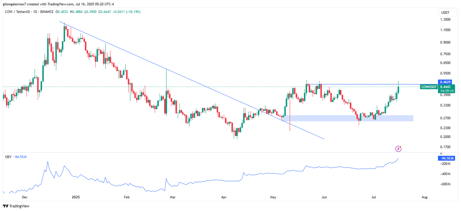 COW’s surge took its price to a key level at $0.46 as the price broke from a bearish structure.