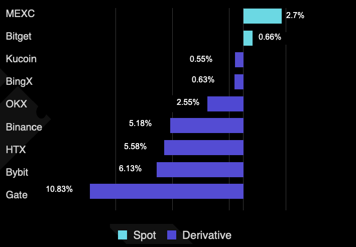 MEXC, which has rapidly emerged as a major CEX in recent years, recorded the largest gain in the spot trading market among exchanges in Q2, rising by 2.7%. The only other exchange to see spot trading growth was Bitget, with spot volumes edging up around 0.7%.
