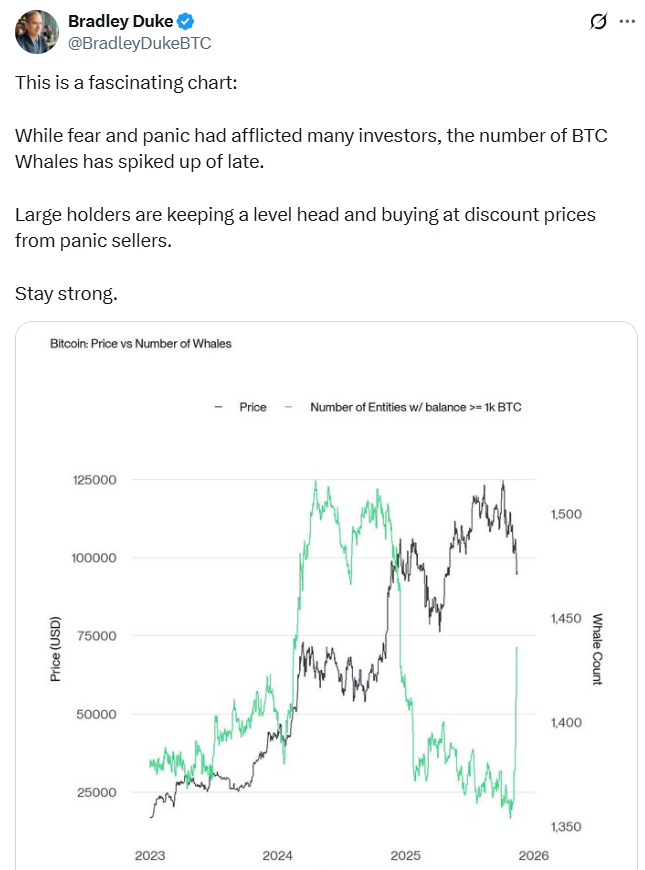 Bradley Duke, managing director and head of Bitwise Asset Management in Europe, said in an X post on Wednesday that his company has noticed that as fear and panic grip the market, whales have been buying the dip.