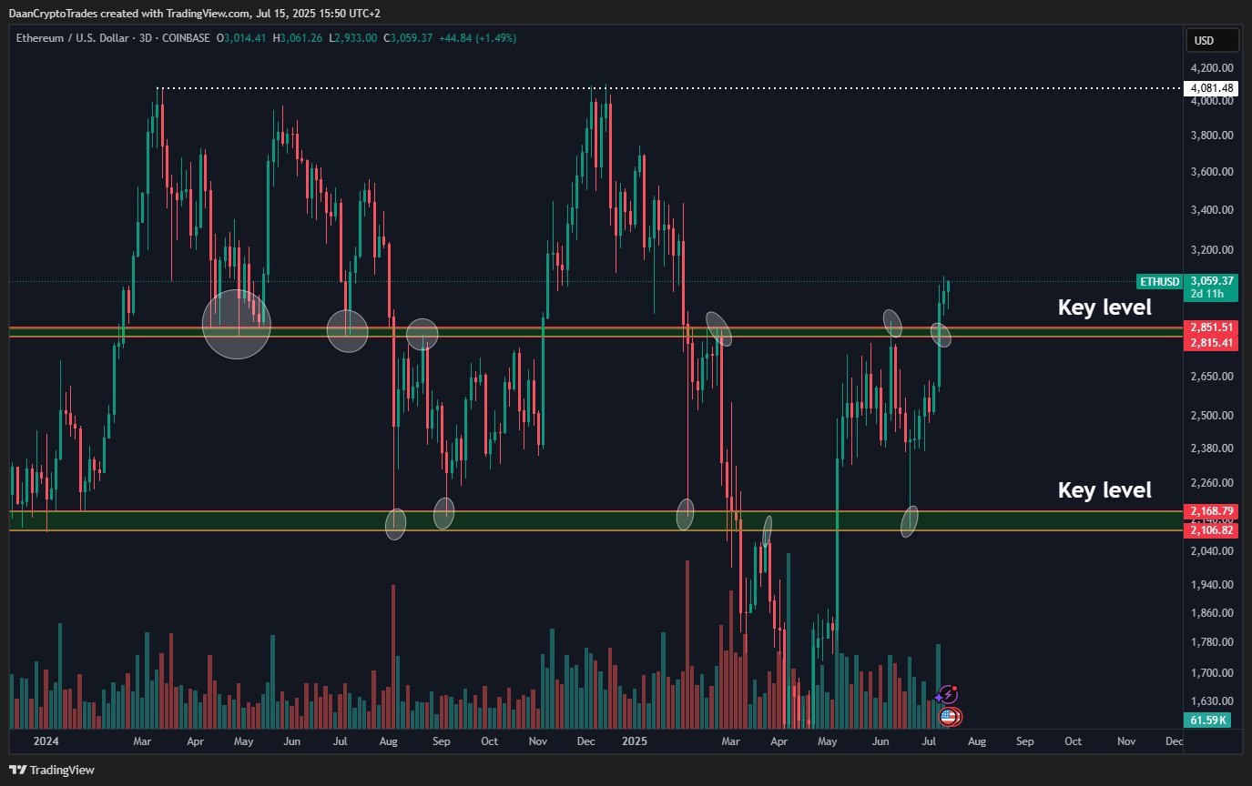 Ether is outperforming Bitcoin this week, with the altcoin reclaiming $3,000.