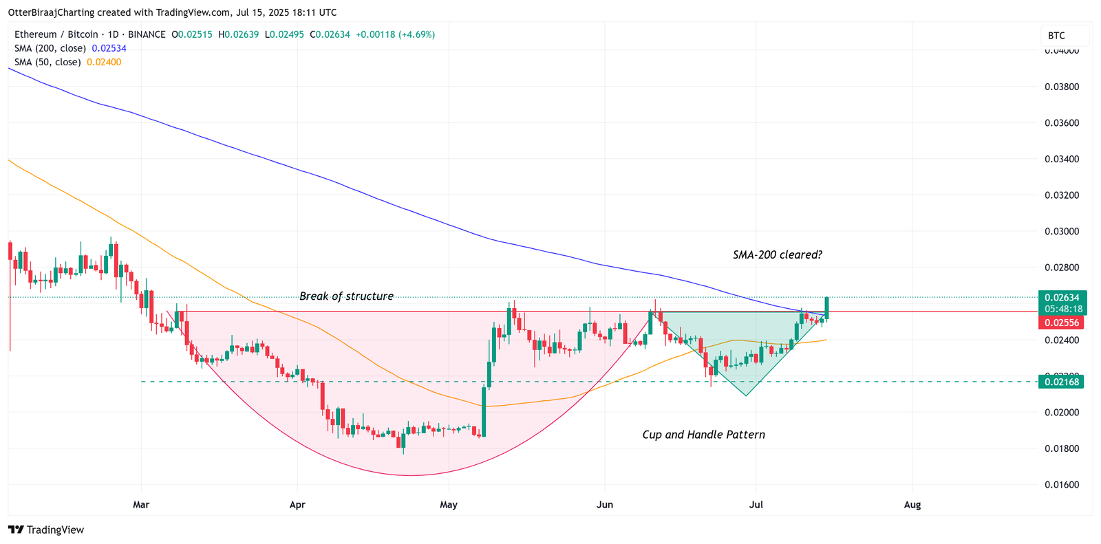 This shift is reflected clearly in the ETH/BTC pair. The one-day ETH/BTC chart has registered a bullish break of structure for the first time since May 24, signaling a trend reversal. Notably, ETH/BTC also reclaimed a position above its 200-day moving average for the first time in a year, signaling medium- to long-term strength.