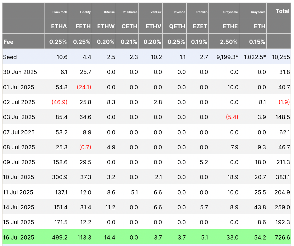 “This is big boy money moving in. Over $726 million poured into ETH ETFs in a single day, with half of that from BlackRock alone. That’s not retail, that’s war.”