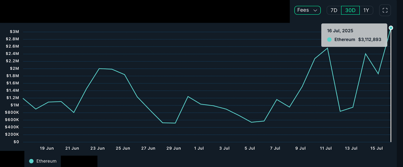Moreover, weekly network fees on Ethereum increased by 139% to $14 million over the past week. On the daily time frame, fees are up over 475% since July 5 to $3.11 million on Thursday, as shown in the chart below.