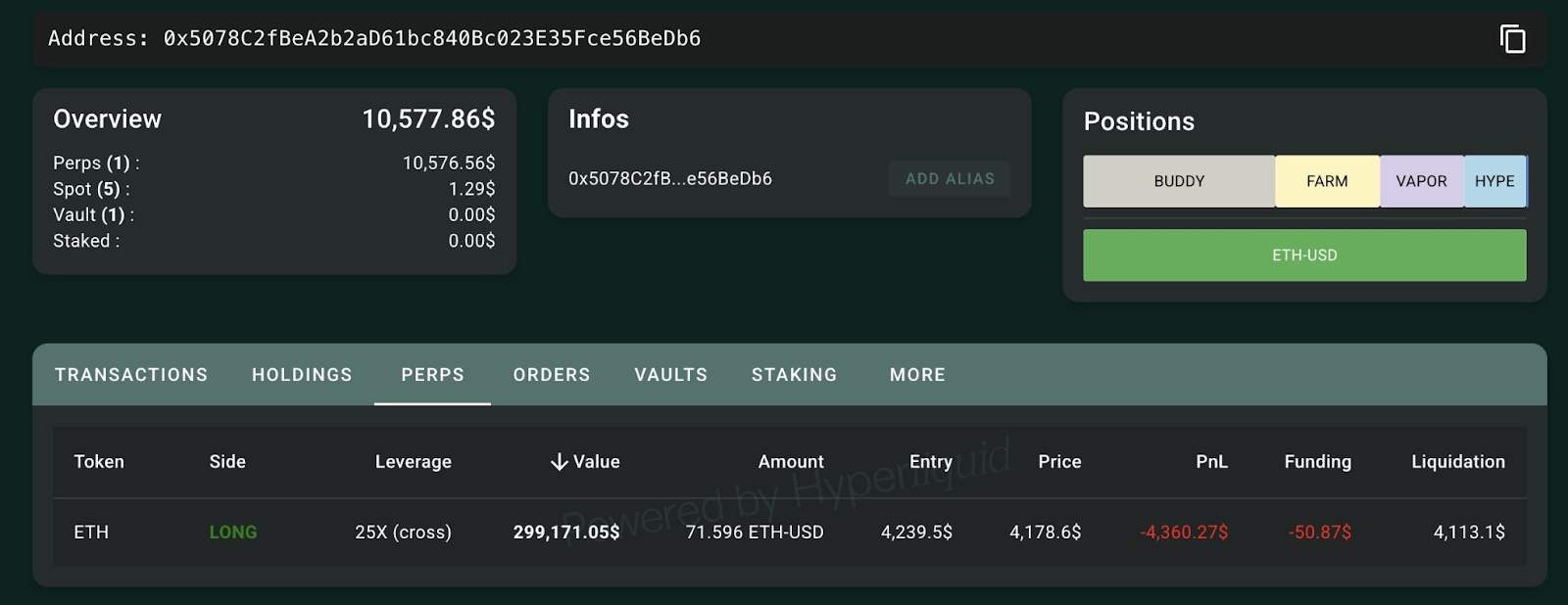 The market downturn also hit other prominent traders. Multimillionaire leverage trader James Wynn’s long Ether position was also partially liquidated, leaving him with a partial long of just $300,000 worth of ETH, which stands to be liquidated if Ether’s price falls below $4,113, according to Lookonchain’s Tuesday X post.