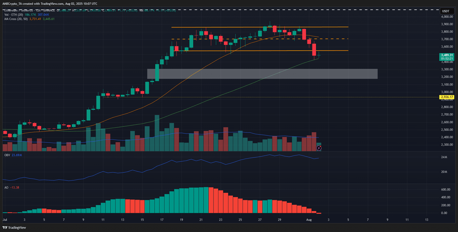 The Fair Value Gap (white) at $3.2k, and the support from earlier in July at $2,936, were the next targets for ETH. The 50-period Moving Average (green) has served as a dynamic support in recent hours.