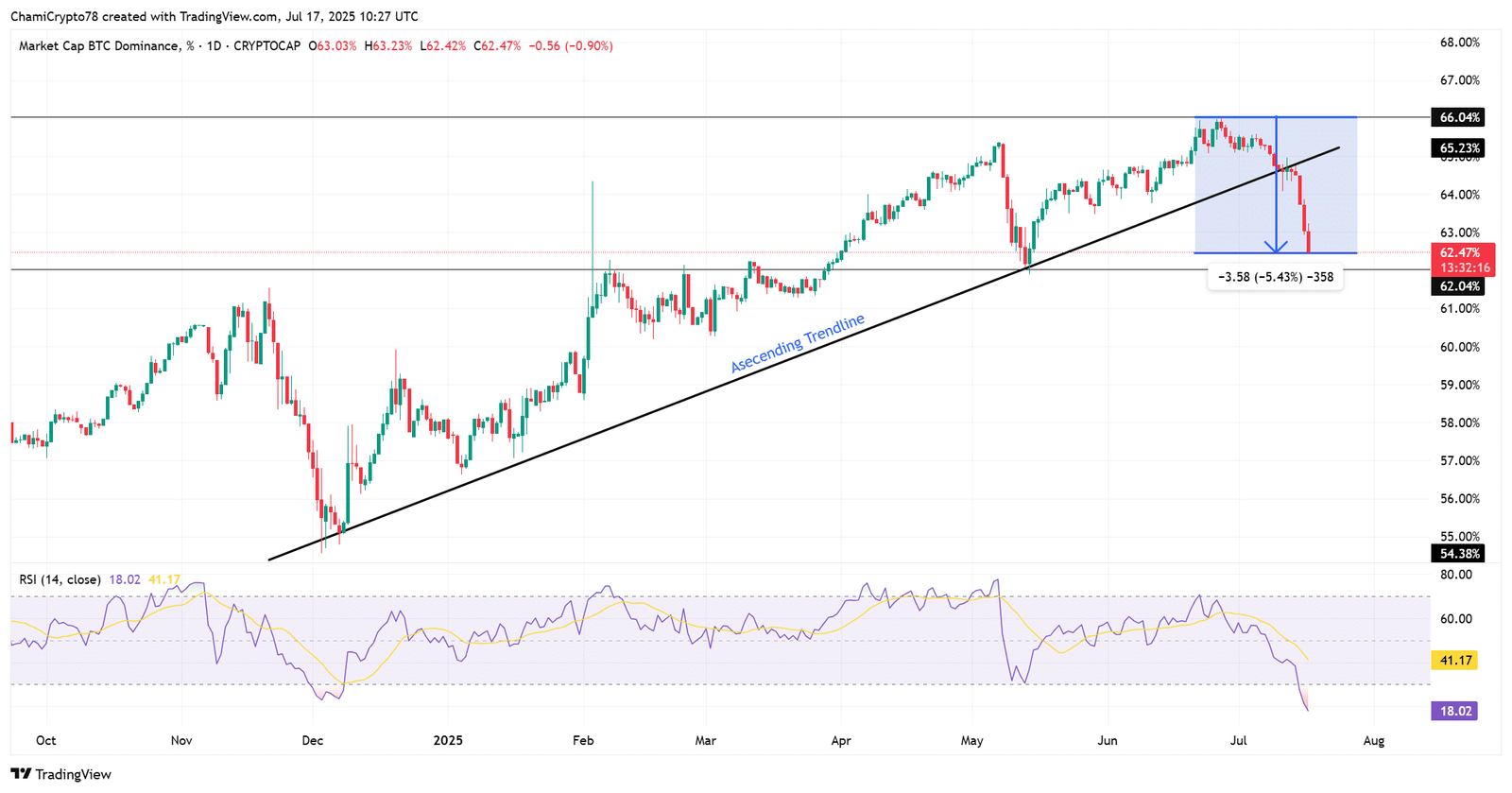Bitcoin dominance has sharply declined from 66.04% to 62.47%, a drop of 5.43%, breaking below an ascending trendline that supported BTC.D since late 2023.